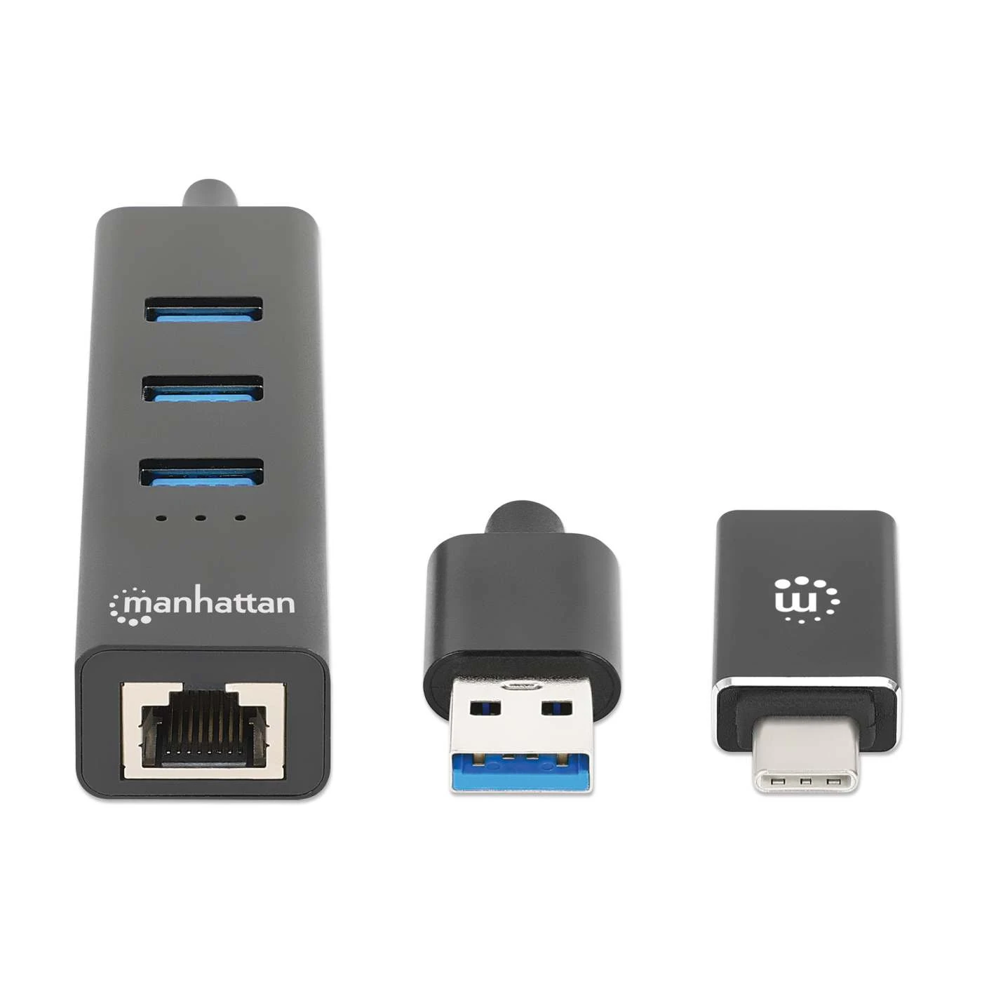 Using one of your device’s USB ports, the Manhattan 3-Port USB 3.0 Type-C/A Combo Hub with Gigabit Ethernet Network Adapter adds wired internet connectivity to your laptop in places where Wi-Fi is unreliable or unavailable. It also gives you three USB-A ports to easily connect a keyboard, mouse, flash drive and more. Devices that fit the USB 3.2 Gen 1 spec (formerly known as USB 3.0) can reach transfer speeds up to 5 Gbps for external storage, printing and more. The hub’s SuperSpeed ports are backward compatible with older USB versions 2.0 or even 1.1. You can also charge your phone or tablet since the hub supplies up to 5 V / 0.9 A of power.