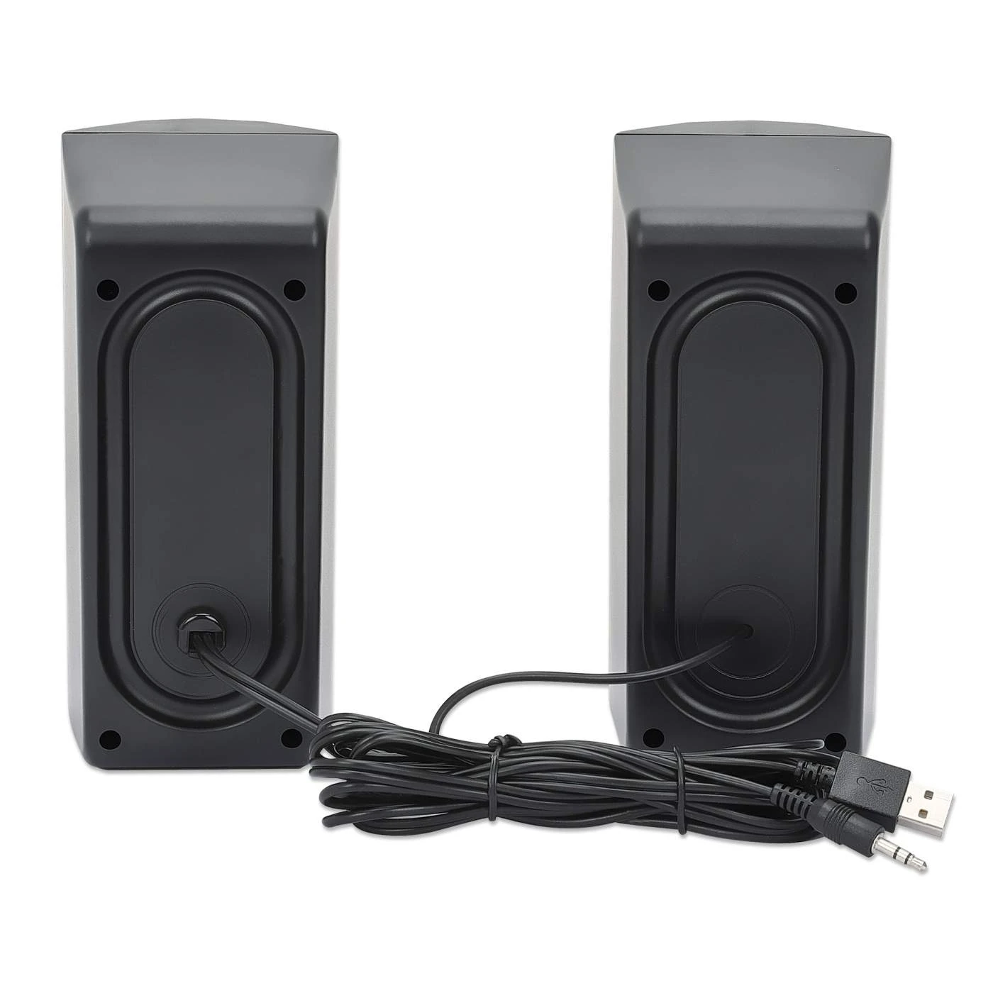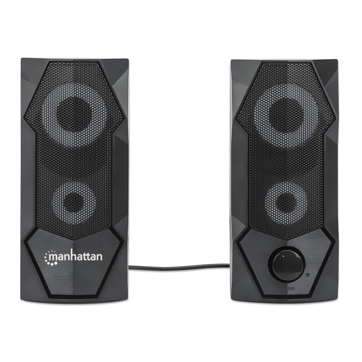 The Manhattan RGB LED Desktop Stereo Computer Speakers offer simple setup and controls for a convenient, enjoyable listening experience. This set of two PC speakers is compact and moveable but offers rich, powerful sound. They make a great upgrade from your built-in notebook or monitor speakers.