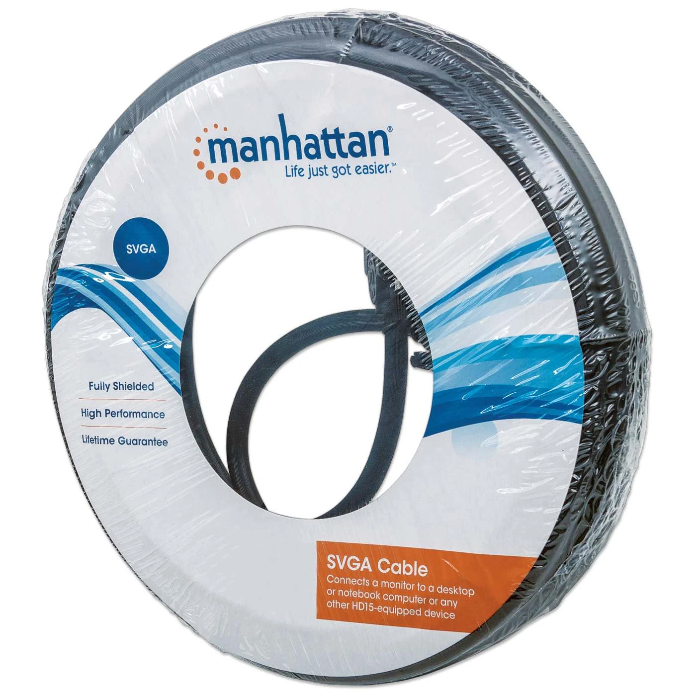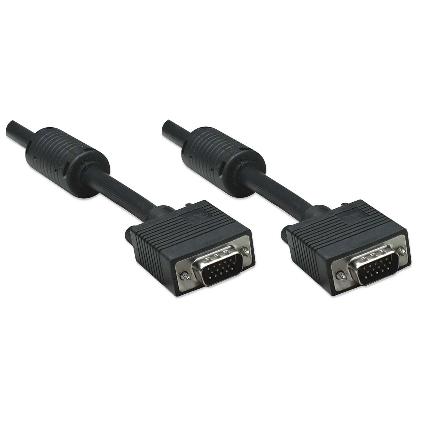 Manhattan SVGA Cables easily connect a monitor with a desktop or notebook computer. Ideal for use with video splitters, KVM switches and any HD15-equipped display, computer or device, Manhattan SVGA Cables are engineered and constructed of quality materials to deliver dependable transmissions in video applications. Full foil and braided shielding with ferrite cores help minimize EMI interference and mini-coax (RGB) with paired video wire construction combine to provide maximum conductivity and clear, crisp images with reduced distortion over extended distances.