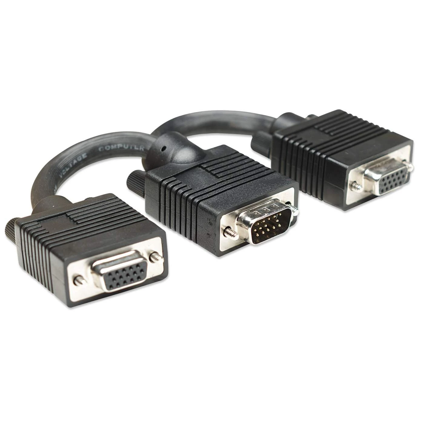 Manhattan SVGA Y Cables easily split a single signal to connect a desktop or notebook computer with two monitors. Ideal for use with any HD15-equipped display, computer or device, Manhattan SVGA Cables are engineered and constructed of quality materials to deliver dependable transmissions in video applications. Full foil and braided shielding, molded boots with strain relief and mini-coax (RGB) and paired video wire construction help provide maximum conductivity and clear, crisp images with reduced EMI interference and distortion over extended distances.