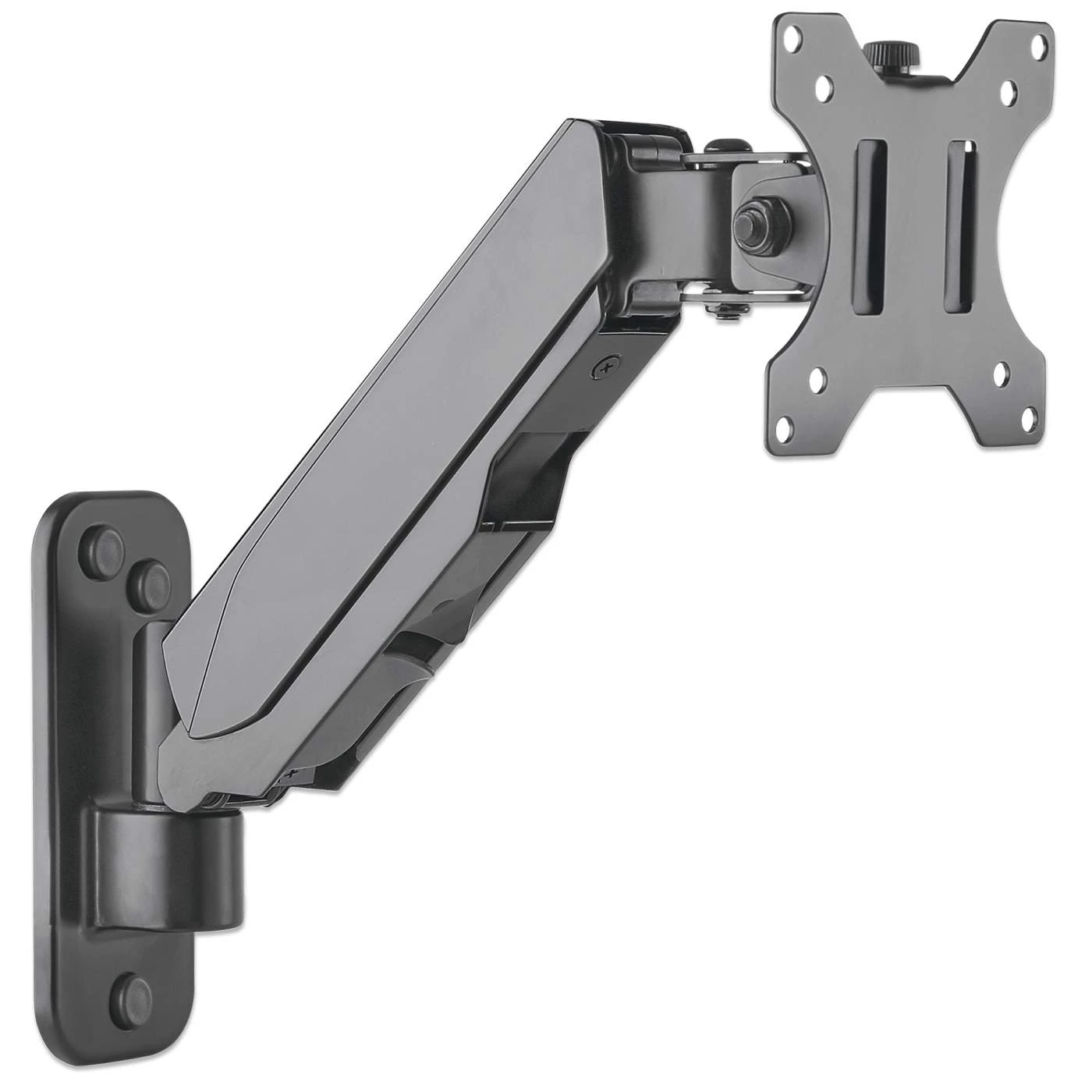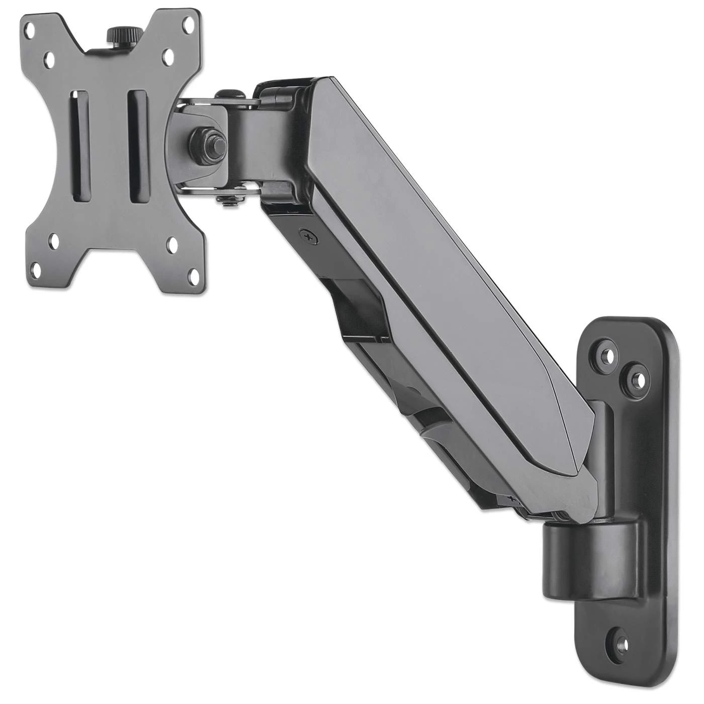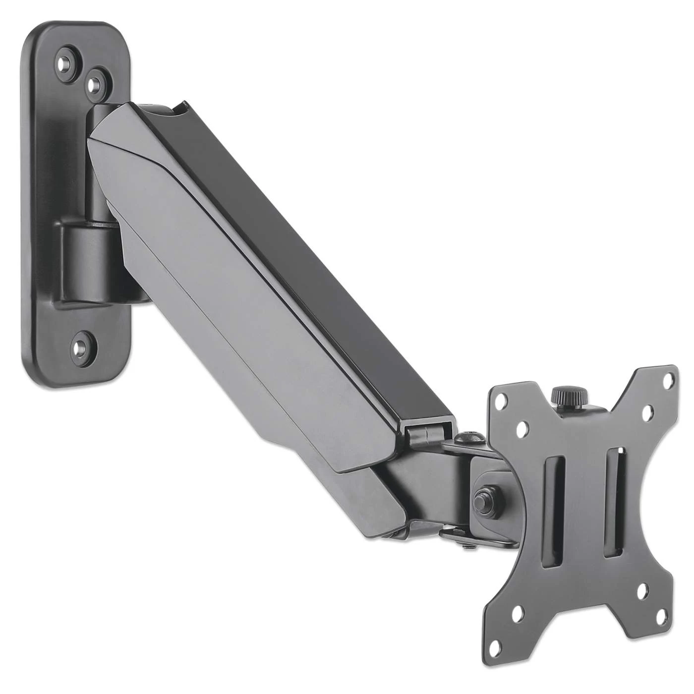 The Manhattan Universal Gas Spring Monitor Wall Mount offers a single-jointed gas-spring arm to securely hold one 17″ to 32″ TV or monitor. This mount’s gas spring promotes easy movement of the monitor or TV to a more comfortable viewing angle with the lightest touch. Designed to be installed on the wall to give back much-needed desktop real estate, the Manhattan Universal Gas Spring Monitor Wall Mount provides more flexibility, reach, and overall enjoyment of whatever task is at hand.