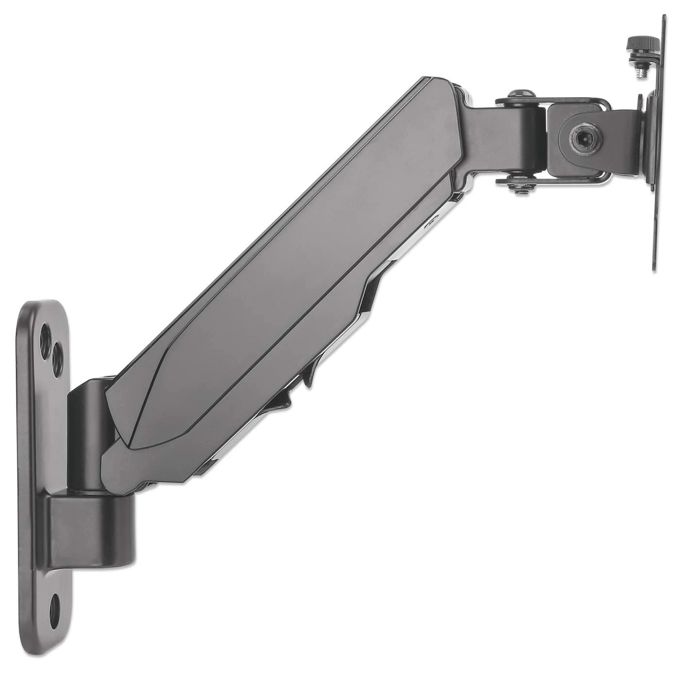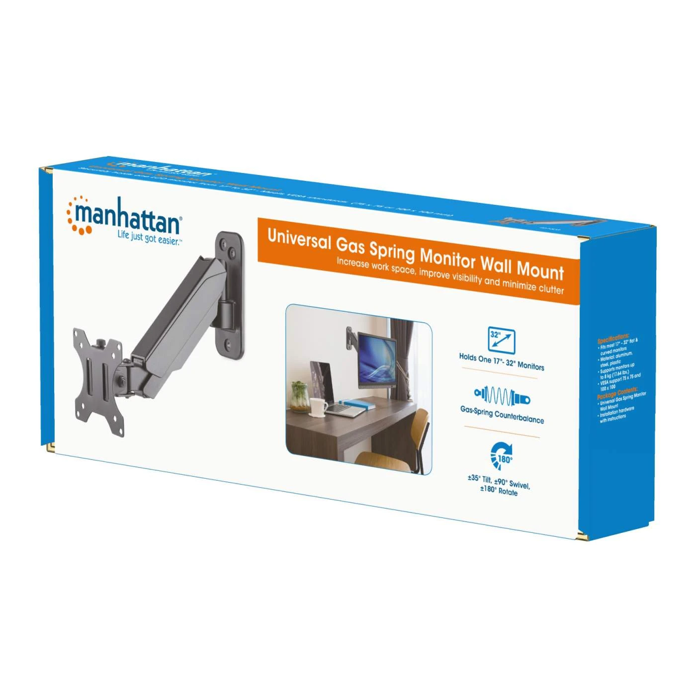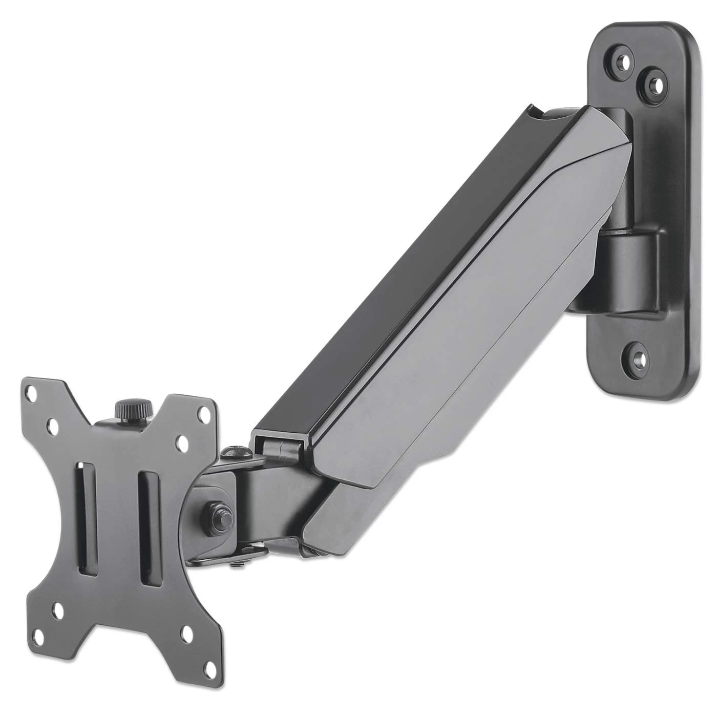 The Manhattan Universal Gas Spring Monitor Wall Mount offers a single-jointed gas-spring arm to securely hold one 17″ to 32″ TV or monitor. This mount’s gas spring promotes easy movement of the monitor or TV to a more comfortable viewing angle with the lightest touch. Designed to be installed on the wall to give back much-needed desktop real estate, the Manhattan Universal Gas Spring Monitor Wall Mount provides more flexibility, reach, and overall enjoyment of whatever task is at hand.