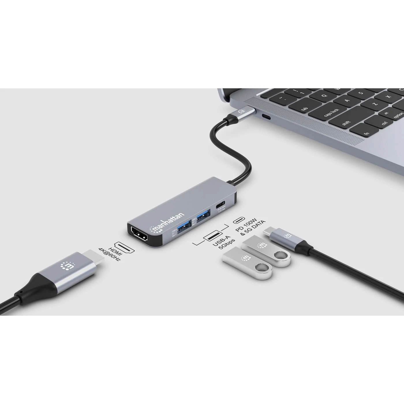 Unlock the full potential of your USB-C device with the Manhattan USB-C to HDMI 4-in-1 Dock. Designed to enhance productivity and convenience, this versatile adapter connects your laptop (or other device) to an HDMI display and two USB-A peripherals, all while keeping it charged with up to 100 W of Power Delivery.
